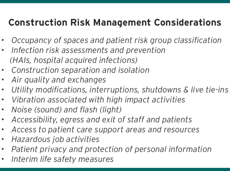 - Constant awareness of the healthcare building’s physical environment (i.e., mechanical and plumbing infrastructure) to isolate the work and ensure other parts of the hospital remain operational