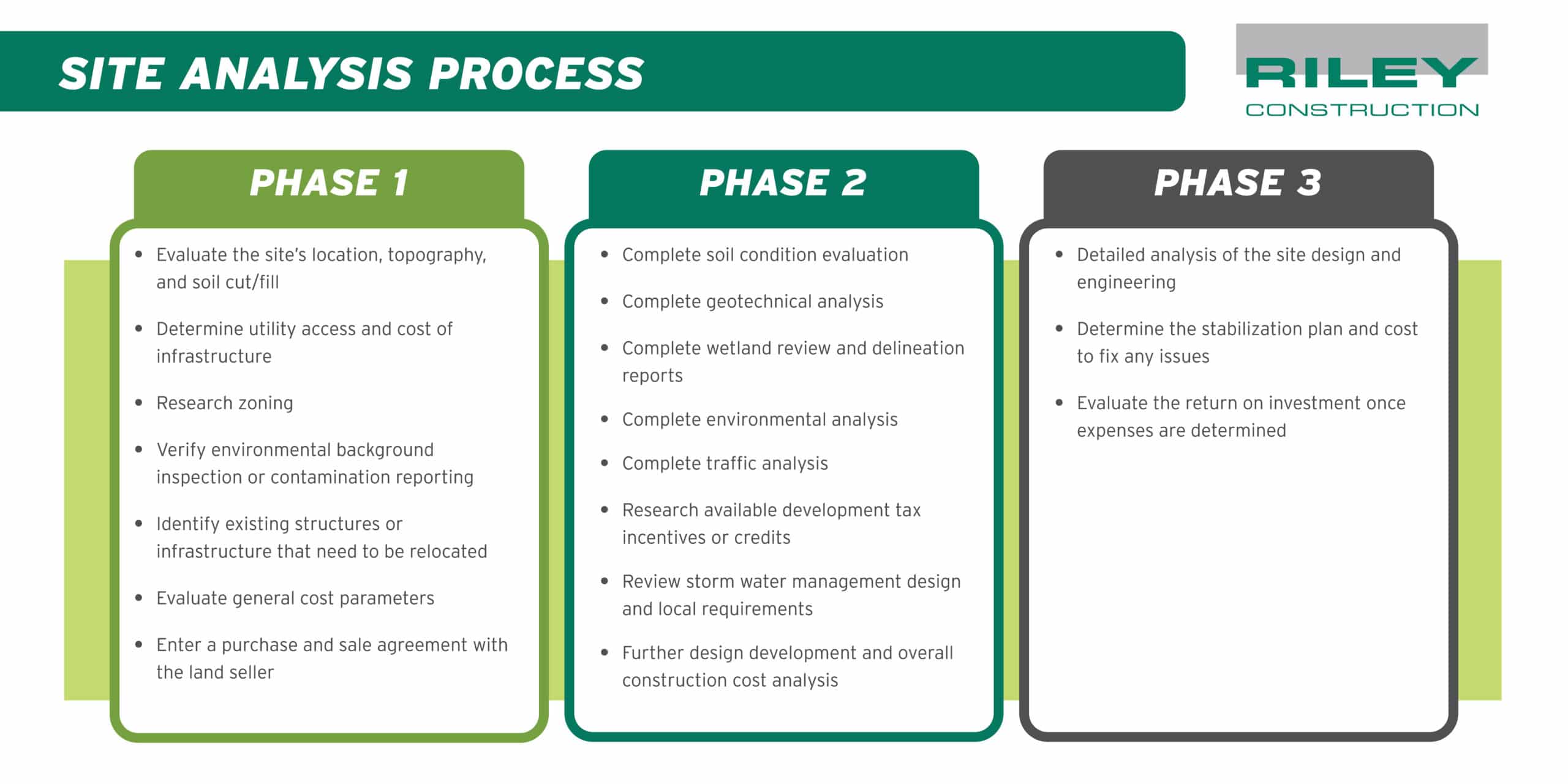 Within 4 to 6 weeks, the Riley Construction team and civil engineers can complete a diligent analysis of site issues. This analysis will determine whether a building project moves forward or if it’s back to the drawing board.