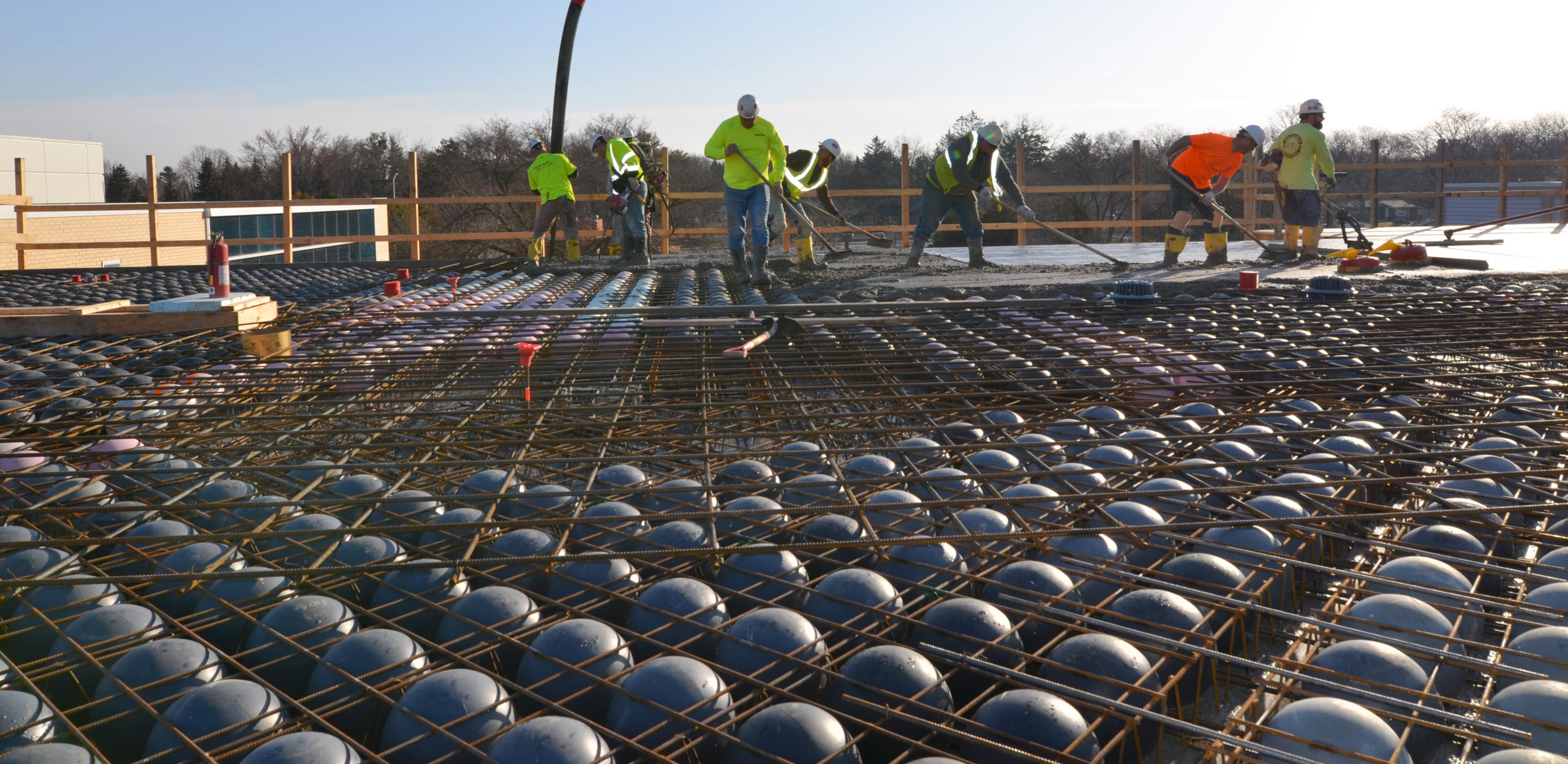 Riley Construction recently saved a client both time and money by using an innovative concrete slab technology on a large healthcare construction project. This patented technique, called BubbleDeck, replaces up to 35%* of a concrete slab with plastic air-filled bubbles that act as a void. The bubbles are inserted into the slab and held in place by reinforcing steel mesh on the top and bottom. The bubbles displace concrete without sacrificing structural strength.