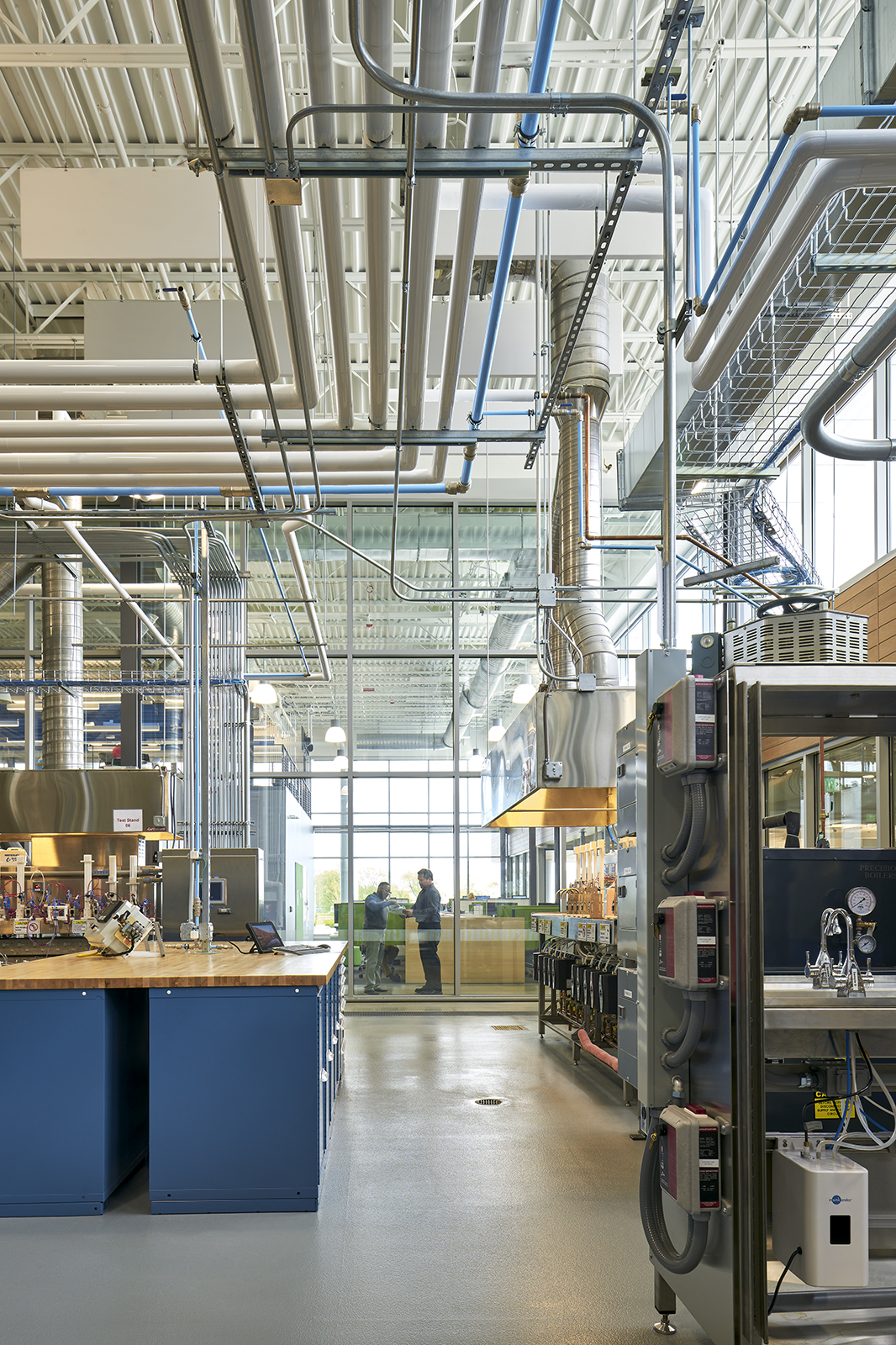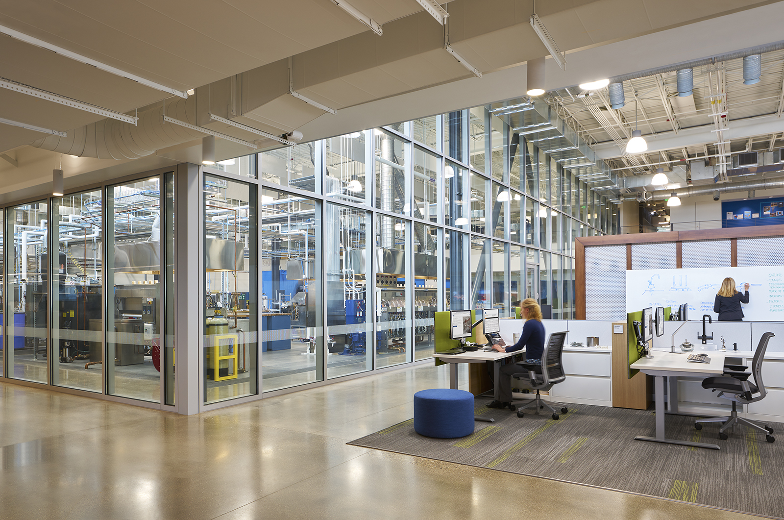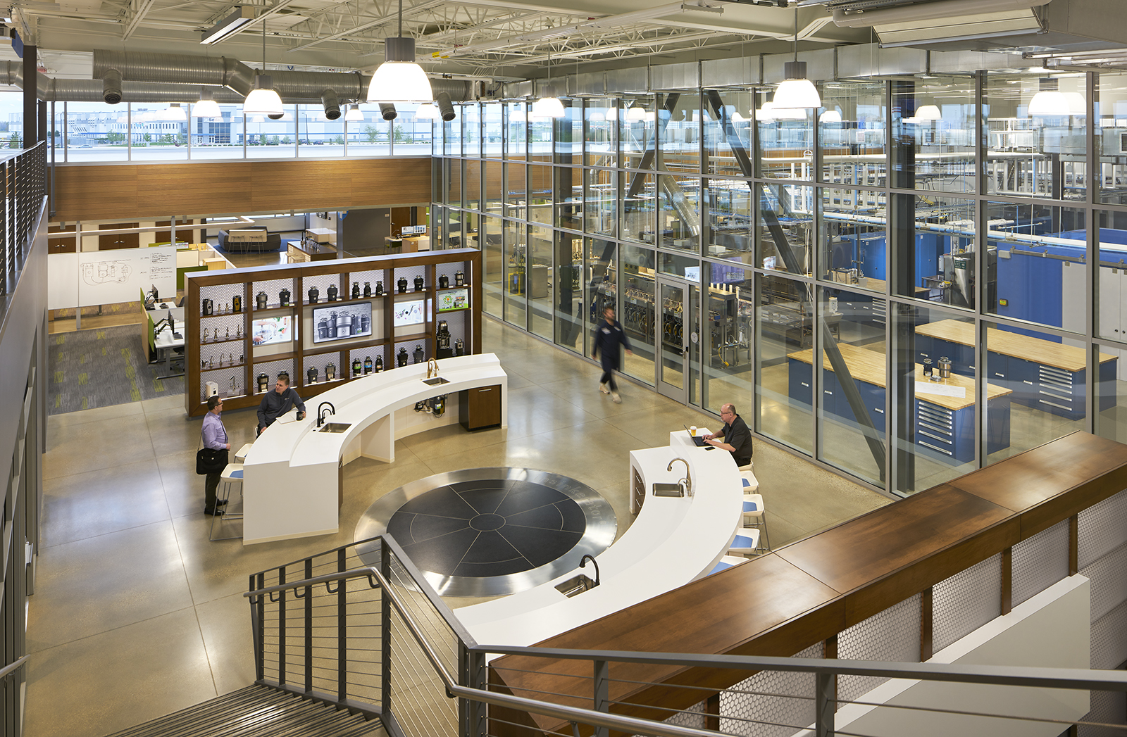 The interior includes private offices with glass doors; multiple interaction areas; open office zones; a fitness center; a two-story product display area; and a work café mezzanine — all with unobstructed views into the testing laboratory facilities.