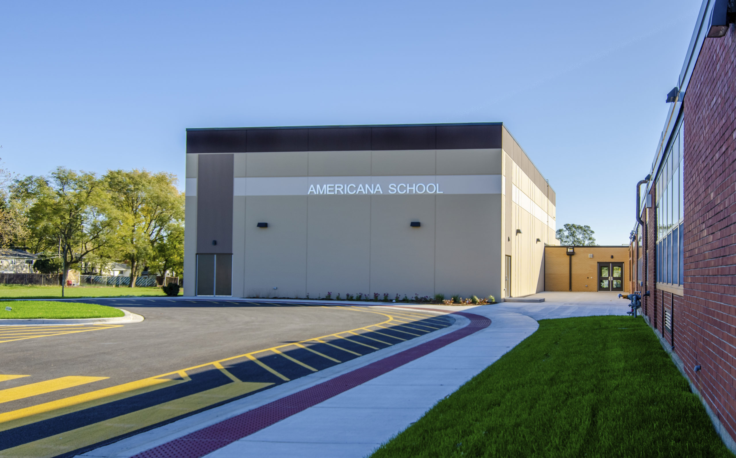 Americana: Includes a 6,000 SF gym (MPR) addition and renovation of the library(LMC). The gym addition includes basketball courts, volleyball courts, acoustical wall and ceiling panels, resilient flooring. The sitework includes a new poured surface playground, new stormwater detention basin and new parking lot, which incorporates student pickup/drop off.