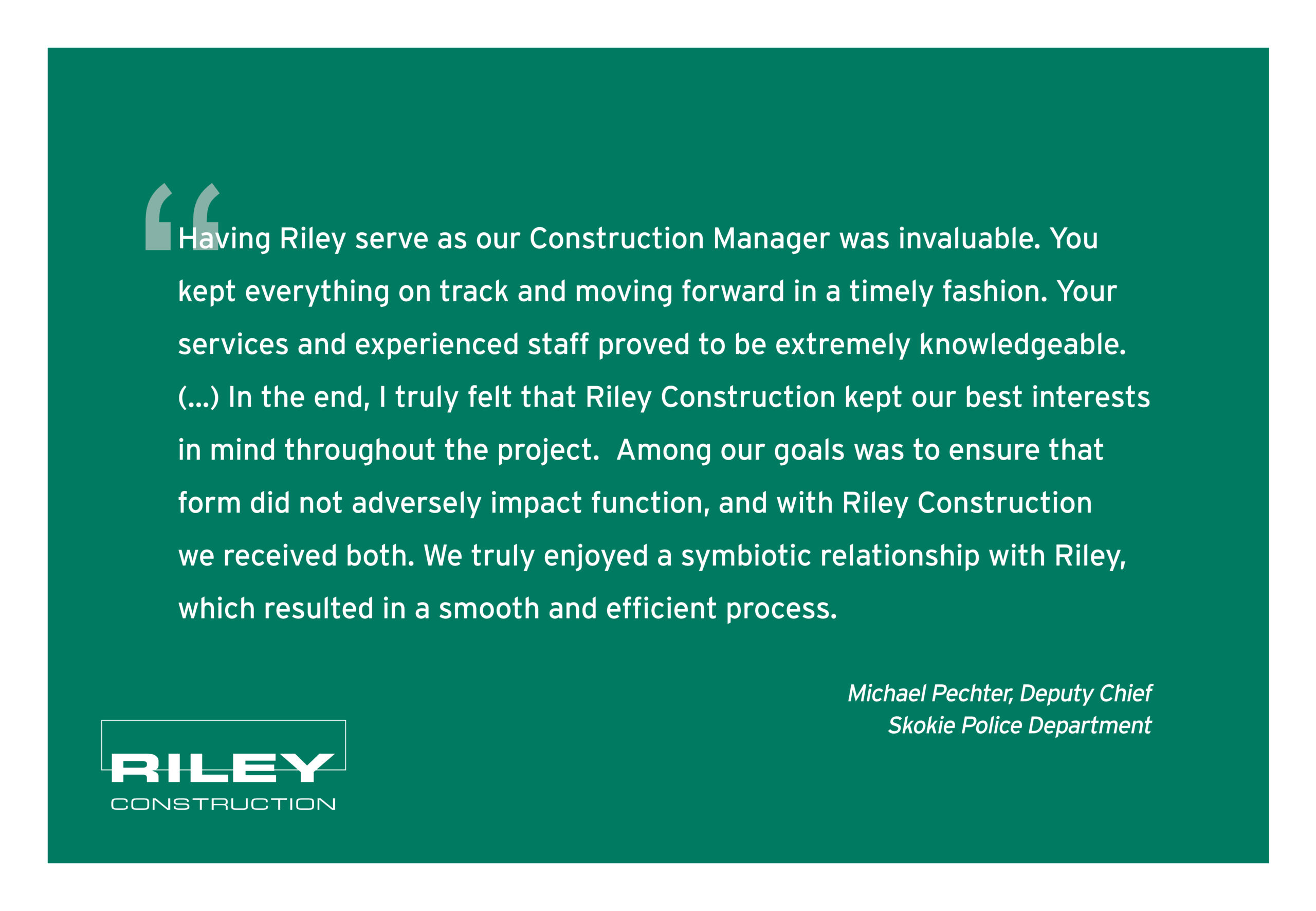 USGBC-100pxThe project consists of the adaptive re-purposing of an existing 136,000 SF precast concrete structure of an industrial building, on a six acre site.  The 79,118 SF police headquarters is located on a single level building, and contains police administration offices, 911-dispatch, lock-up, fitness and locker room facilities, indoor shooting range, 35 indoor squad parking and 28 covered parking, and a training room that was built as a dual-purpose space which was converted into the Village’s Emergency Operations Center.  Riley Construction provided full professional preconstruction and construction management services throughout the successful delivery of the project.